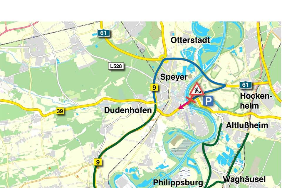 Schon eine ganze Menge an Vorbereitungen. Der Parkplatz am Luxhof auf badischer Seite für Pendler ist gebaut. Die beiden Ampelanlagen an der Anschlussstelle Hockenheim und am Knoten Bundesstraße B39/B9 auf rheinland-pfälzischer Seite bei Dudenhofen sind eingerichtet. Die zuständige Baufirma BWS hat ihre Baucontainer aufgestellt. Die Haltestelle für den Shuttlebus am bestehenden Parkplatz am Luxhof wird gegen Ende der Woche eingerichtet. Die Umleitungsbeschilderung wird spätestens von Sonntag auf Montag aufgestellt. Unter der Brücke haben wir begonnen, das Granitmauerwerk abzubrechen. Das sieht man von oben allerdings nicht.