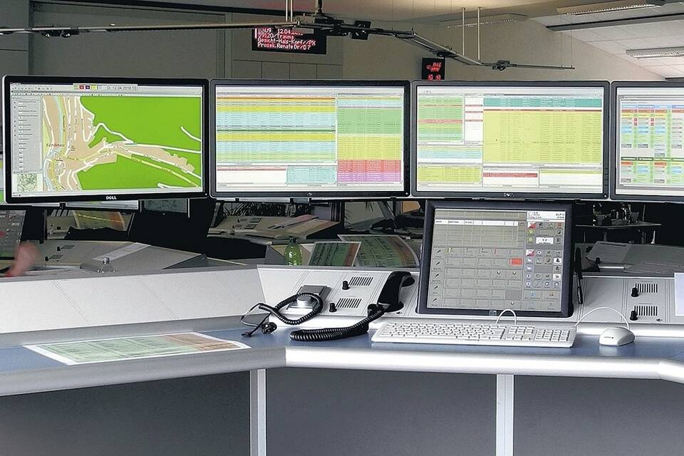 So sieht der Arbeitsplatz eines Disponenten in der Rettungsleitstelle in Ladenburg aus. Von hier aus werden die Einsätze in Heidelberg, Mannheim und dem Rhein-Neckar-Kreis koordiniert. Foto: Burkhardt