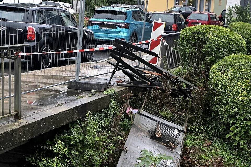 Die Sitzbank erlitt Totalschaden, die beschädigte Straßenlaterne und das zerstörte Brückengeländer sollen ersetzt werden.