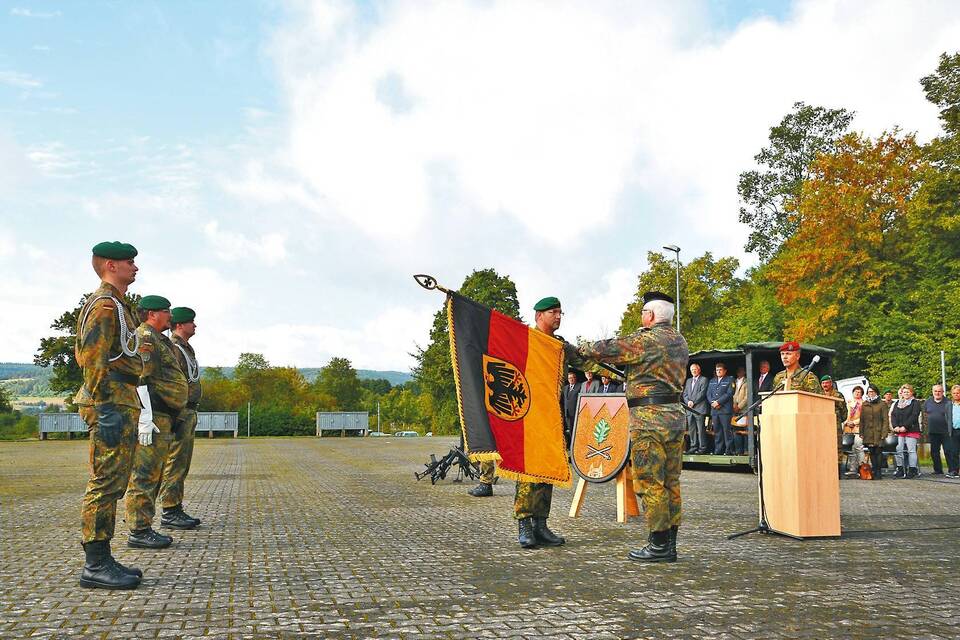 Der Kommandeur des Sicherungsbataillons 12, Oberstleutnant Heiko Wömpener, übergab im Rahmen eines feierlichen Appells am Freitagmorgen die Truppenfahne an Oberst Wolf-Dietrich Rupp und verlässt damit Hardheim. Fotos: A. Rechner