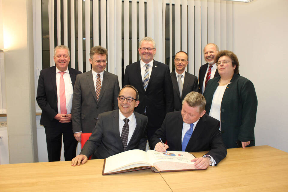 Hierbei trug sich der Bundesminister im Beisein von Bürgermeister Roland Burger, Landrat Dr. Achim Brötel, Vertretern der Neckar-Odenwald-Kliniken und Ehrengästen auch ins Goldene Buch der Stadt Buchen ein.