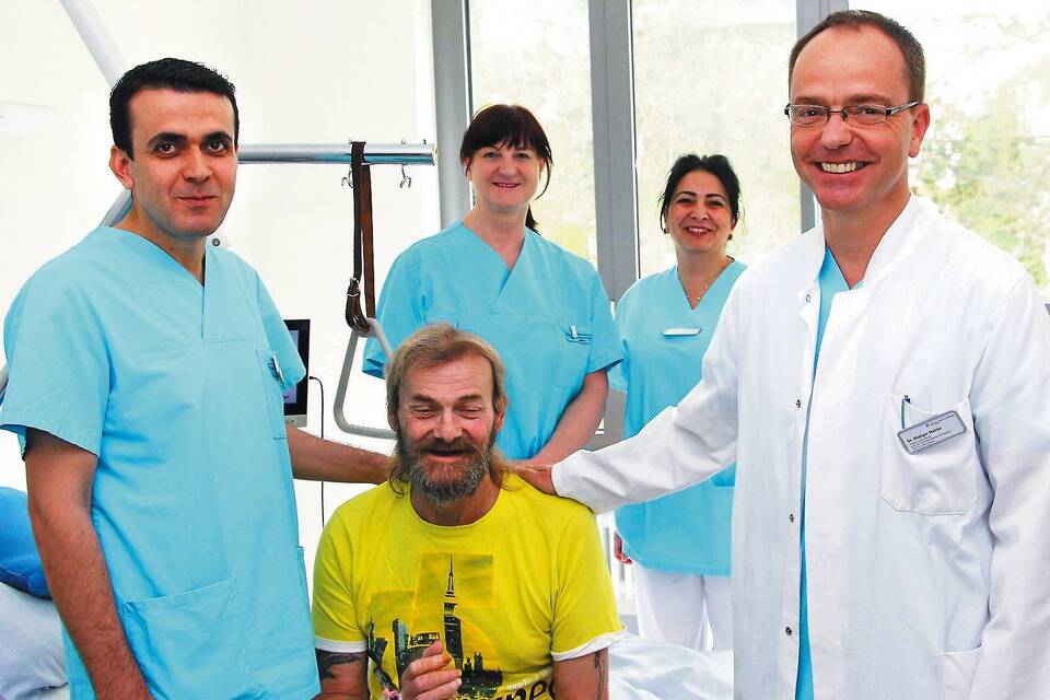 Mit der Hot-Axios-Methode erfolgreich behandelt und sichtlich wohlauf: Gerhard Schinnagel aus Buchen mit Chefarzt Dr. Mahler (rechts) und Oberarzt Dr. med. Majid Hasan. Links im Hintergrund Cornelia Kratzer, Pflegeleiterin Endoskopie Mosbach/Buchen, rechts die Pflegerin Nuray Gül. Foto: Neckar-Odenwald-Kliniken