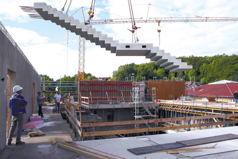 Die frei tragende Treppe, ein Gestaltungsdetail im großzügig bemessenen Eingangsbereich der Schule, war per Tieflader angeliefert worden. Ein talseitig vor dem Neubau platzierter Schwerlastkran hievte das 16 Tonnen schwere Bauteil zwar binnen weniger Minuten an seinen Bestimmungsort. Dort war dann allerdings aufwändige, schweißtreibende und gelegentlich spektakulär erscheinende Millimeterarbeit notwendig, um die "schwebende" Treppen exakt so zu platzieren, dass zwei aus der Wand ragenden Stahlträger in die entsprechenden Aussparungen in des Fertigteils gleiten konnten.