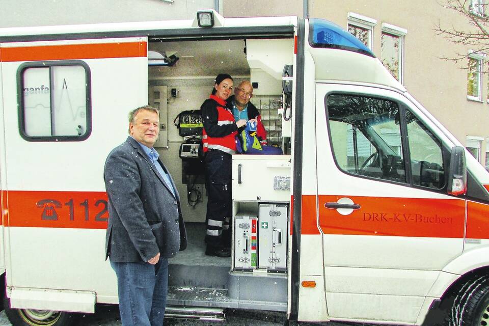 Jessica Dieterich beendete ihre dreijährige Ausbildung mit dem Staatsexamen. Unser Foto zeigt (v.l.) Kreisgeschäftsführer Joachim Herrmann, Notfallsanitäterin Jessica Dieterich und Lehrrettungsassistent Gerald Löhr im Hintergrund. Foto: DRK-Kreisverband Buchen
