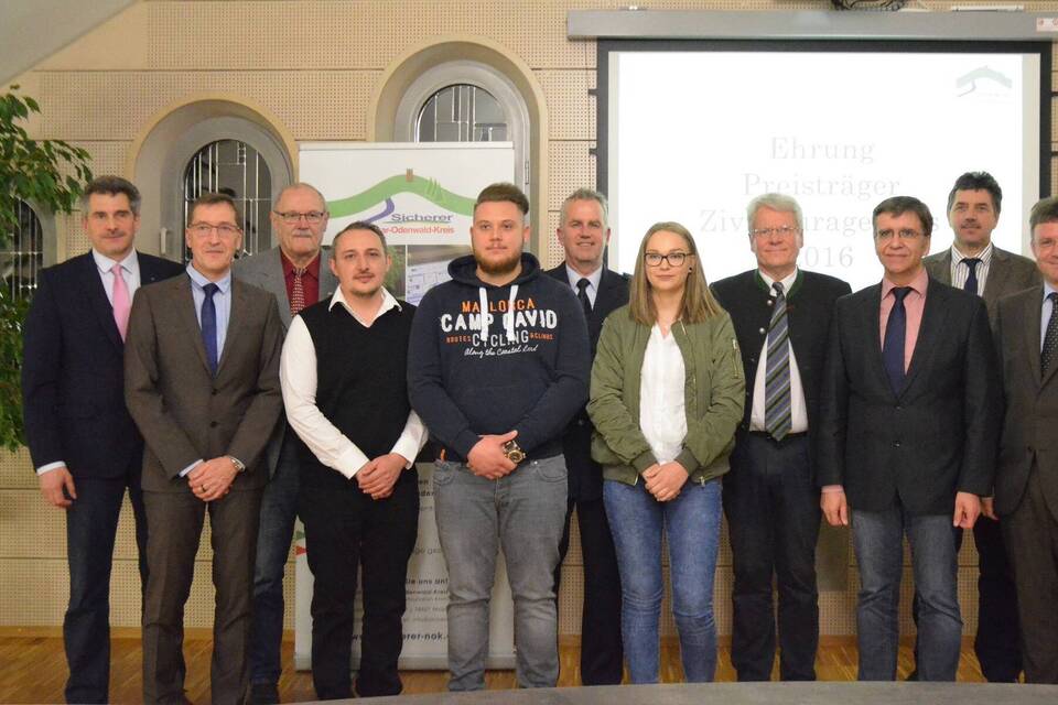 Bei der Verleihung des Zivilcouragepreises (v.l.): Neunkirchens Bürgermeister Bernhard Knörzer, der Geschäftsführer des Vereins "Sicherer Neckar-Odenwald-Kreis", Werner Broßmann, Bürgermeister-Stellvertreter Herbert Kilian ( Walldürn), die Preisträger Igor Zimmer und René Kampl, Polizeivizepräsident Hans Becker, Preisträgerin Denise Hirschmann, Alexander Gerstlauer vom Rotary Club, die Bürgermeister Klaus Gramlich (Adelsheim) und Volker Rohm (Hardheim) sowie Landrat Dr. Achim Brötel. Foto: Judith Blüthner