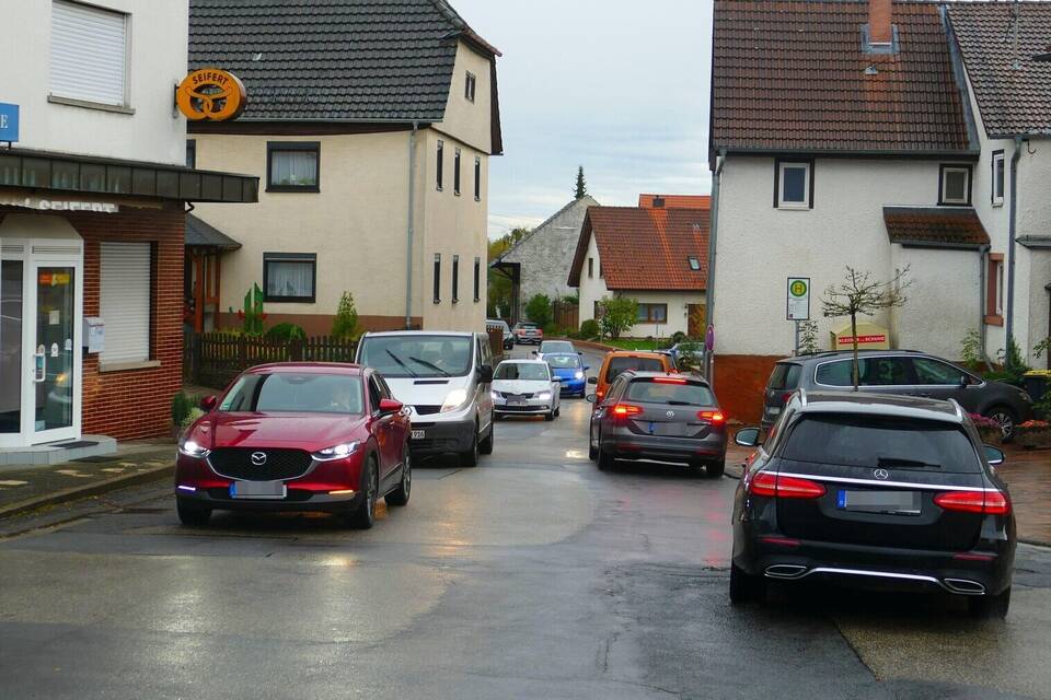 Verkehr in engen Straßen von Hainstadt ist extrem chaotisch