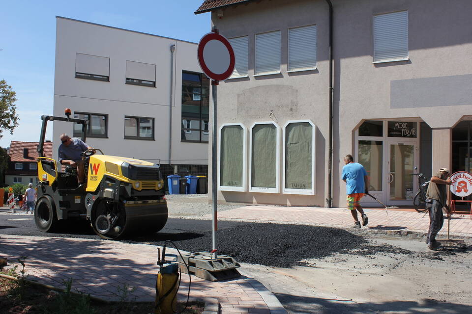 Unser Foto zeigt die Arbeiten, die aktuell von der Firma Tomac zwischen Ärztehaus und Stadtmitte durchgeführt werden. Momentan wird die Fahrbahn geteert. Die Gehwege sind bereits gebaut.