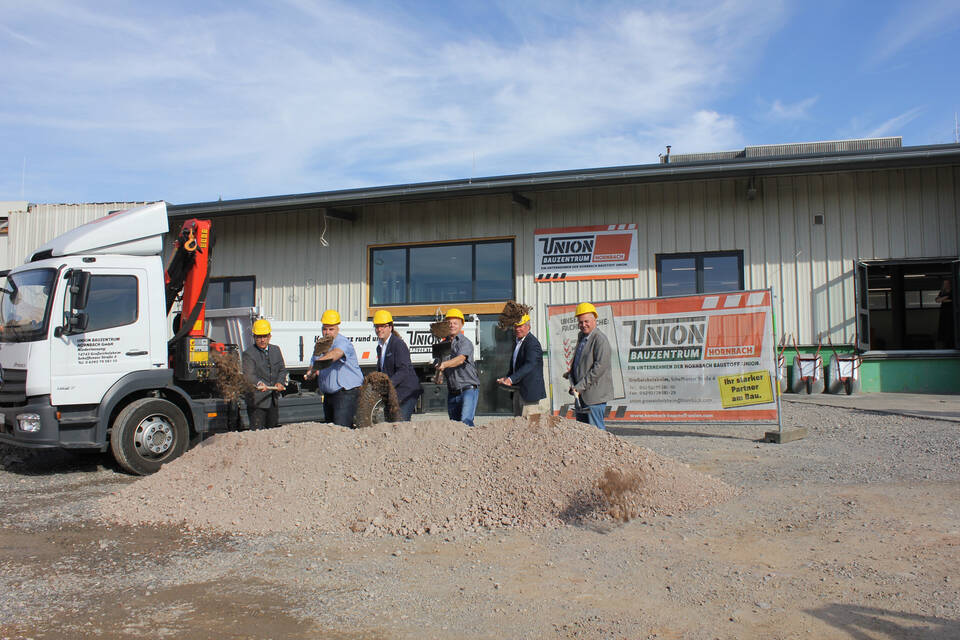 Buchen. (tra) Die Arbeiten am Union-Bauzentrum Hornbach gehen voran: Die Kernsanierung des bestehenden Verkaufsgebäudes ist abgeschlossen, ebenso einige Baumaßnahmen auf dem Außengelände. Die Union-Bauzentrum Hornbach GmbH hatte das 10.000 Quadratmeter große Gelände 2016 erworben und startete im Januar 2017 mit den ersten Arbeiten. Gestern wurde nun mit einem "verspäteten" ersten Spatenstich offiziell der Baufortschritt in der vorderen Wanne 1 (früher Müssig/ZG-Raiffeisen) gefeiert.