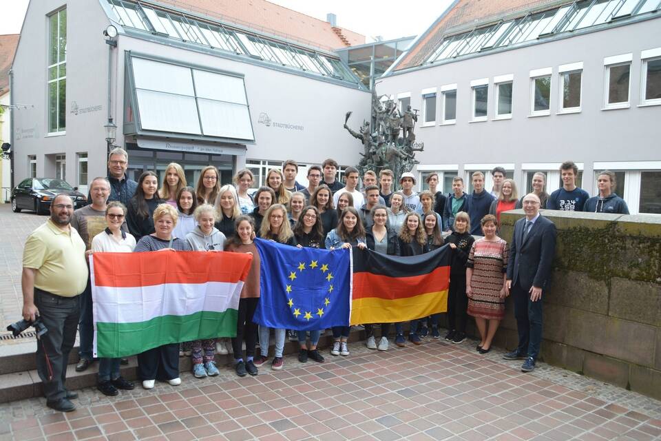 Die Schüler aus Ungarn nach Empfang der Stadt Buchen im Alten Rathaus vor dem Narrenbrunnen zusammen mit Schulleiter Jochen Schwab, Bürgermeisterstellvertreterin Ruth Weniger und den ungarischen Lehrern Gábor Széles und Zsuzsanna Laffer sowie den Lehrkräften des Seminarkurses Europa Christina Hohnerlein, Joachim Hörr und Gerald Kaiser.