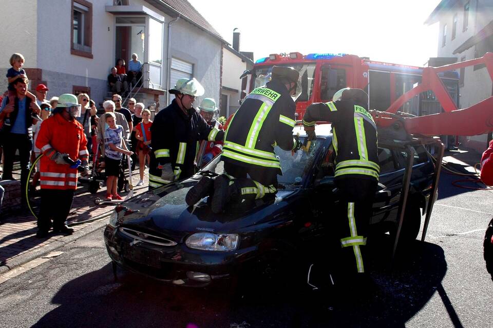 Weiter ging es an die Kreuzung Mantelsgraben/Wiesenstraße, wo das Unfallszenario sich wie folgt darstellte: Ein mit zwei Personen besetzter Ford Escort war mit einem aus der Wiesenstraße kommenden Radlader kollidiert. Nachdem sich die Einsatzkräfte über den Hergang informiert hatten, ging es an die Rettung: Um die Verletzten aus dem Auto befreien zu können, musste die Feuerwehr die Scheiben zersägen und die Dachholme lösen. Schließlich wurde vor den Augen des interessierten Publikums das komplette Dach des Ford abgenommen.