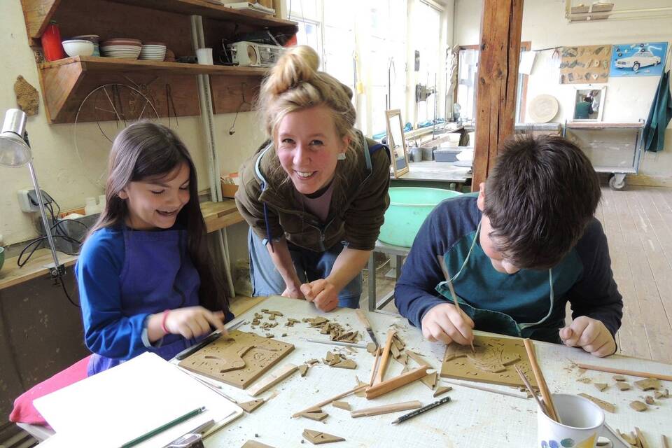 Charlotte Scheidt, Auszubildende im dritten Lehrjahr in der Keramikwerkstatt Schließler, geht Kindern zur Hand, die eine Kachel selbst verzieren. Fotos: Ellen Wartner