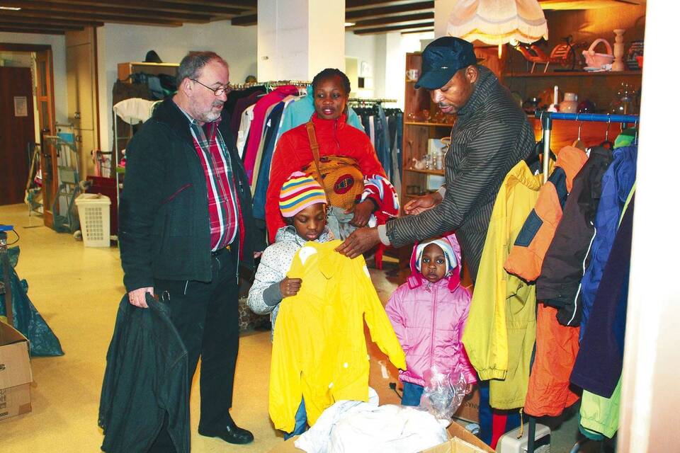 Jeffrey Owie und seine Familie decken sich im kostenlosen Flüchtlingsbasar bei Wolfgang Court (l.) im Dr.-Schmeißer-Stift mit warmen Wintersachen ein. Foto: Christofer Menges