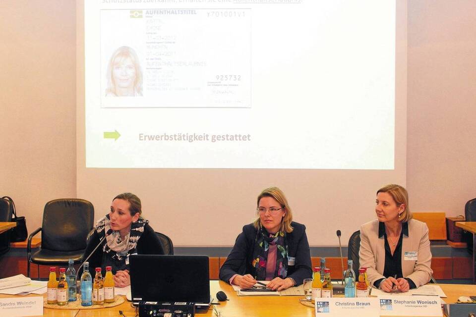 Sandra Weindel von der Ausländerbehörde sowie Christina Braun und Stephanie Wonisch von der Arbeitsagentur informieren über die Beschäftigung von Flüchtlingen. Foto: Menges