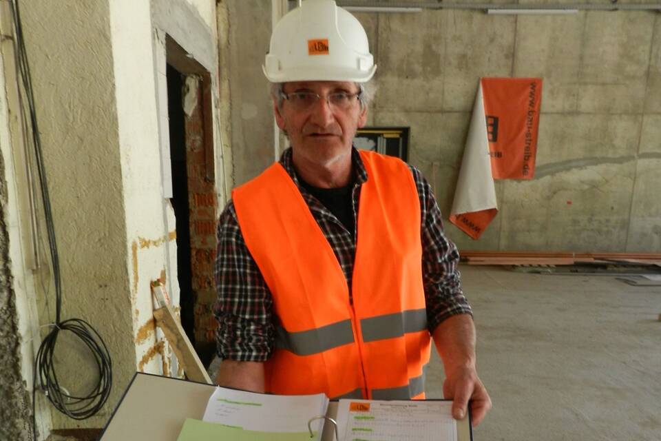 Mit Helm und Sicherheitsweste kommt Josef Gerl in die Fahrzeughalle. Der Polier der Mannheimer Baufirma Streib ist seit 40 Jahren auf dem Bau tätig und hat auch schon größere Projekte mit verantwortet. Jetzt schlägt er einen Din-A-4-Ordner auf. Darin ist akribisch aufgelistet, welche Firma wann mit welchen Mitarbeitern auf der Feuerwehrhaus-Baustelle war. Ebenso sind Telefonnummern notiert, wie diese Personen zu erreichen sind.