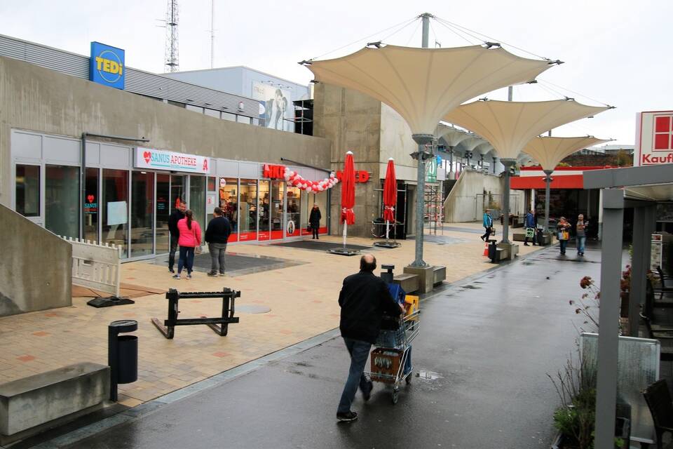 Die Großbaustelle am Buchener Einkaufszentrum am Sendeturm steht kurz vor dem Abschluss: Die Ladenzeile im Eingangsbereich präsentiert sich in komplett neuem Gewand. Während die NKD-Filiale (M.) bereits eröffnet hat, folgt die Sanus-Apotheke (l.) am 15. November.