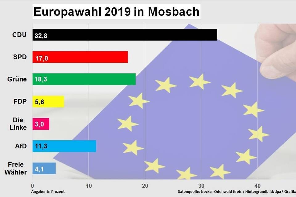 Auf 11,3 Prozent kommt die AfD (+4,0), die FDP erhält 5,6 Prozent (+3,1) und 4,1 Prozent machen ihr Kreuz bei den Freien Wählern (+2,2). Die Linke schafft es in Mosbach auf 3,0 Prozent und ein leichtes Plus von 0,2 Punkten.