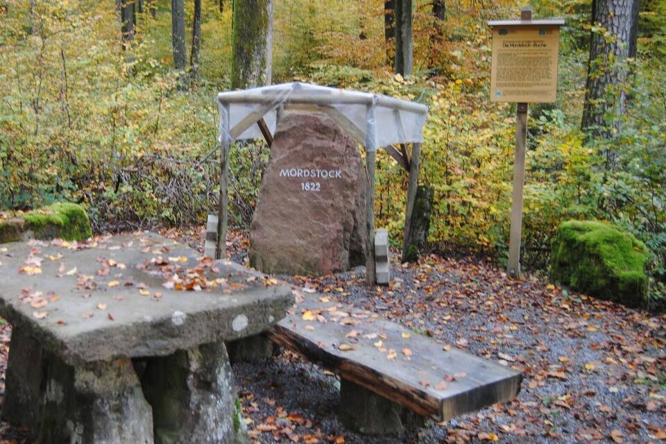 Neunkirchen. Ein paar Gehminuten außerhalb von Neunkirchen lädt ein steinernes Tischchen mit zwei Bänken entlang des Waldweges zum Verweilen ein. Daneben stehen ein alter, morscher Baum sowie zwei junge Buchenstämme, die miteinander verflochten wurden. Und ein Gedenkstein steht hinter dem Tisch. Seine Aufschrift ist weniger idyllisch als der Ort: "Mordstock". Der Stein wurde vom Lions-Club (LC) Kleiner Odenwald gestiftet und wird dieser Tage offiziell eingeweiht. Er erinnert an den Mord an Eva Elisabetha Leibfried, die vor fast 200 Jahren auf dem Weg von Eberbach nach Neunkirchen getötet wurde.
