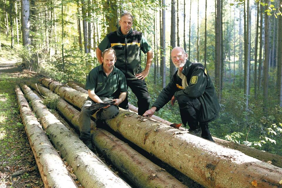 Forstbetriebsleiter Jörg Puchta und die Revierförster Klaus Hanke und Florian Pogorzelski (v.r.) auf einem Polter mit vom Buchdrucker befallenen Fichtenstämmen. Foto: Rüdiger Busch