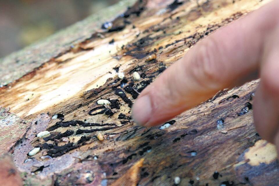 Deshalb sind die Förster permanent auf der Suche nach befallenen Bäumen. "Anfangs ist es noch sehr schwer, sie zu erkennen", erklärt Florian Pogorzelski, denn die Baumkronen sind zunächst noch grün. Braunes Bohrmehl, das sich in den Rindenschuppen oder in Spinnweben am Fuß des Stammes sammelt, ist ein erstes Indiz auf den Schädling.