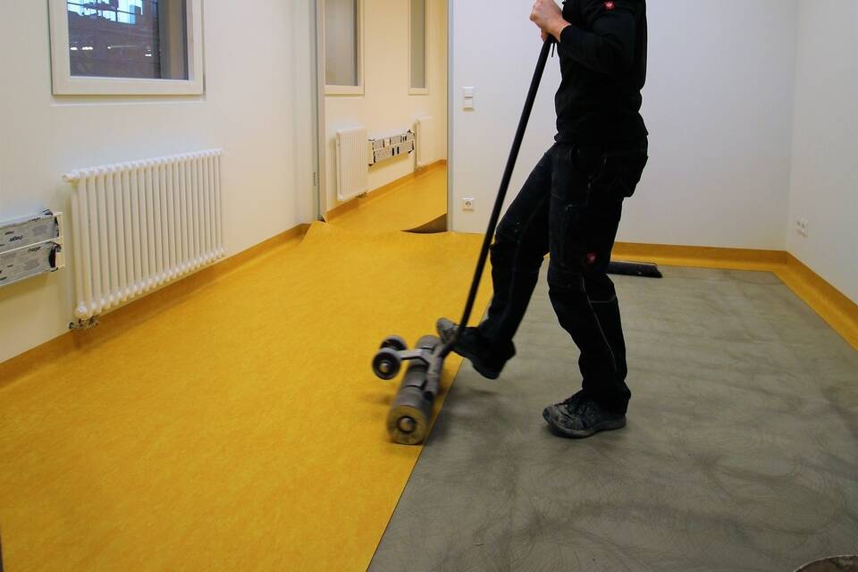 "Jetzt sind wir gerade im Anbau an die chirurgisch-orthopädische Praxis", stellt Karina Paul fest – gut zu erkennen am charakteristischen gelben Bodenbelag. Ein Modul weiter ist die Eingangstür der Praxis zu erkennen. Die Platznot der Praxis und des OP-Bereichs soll durch den Anbau gelindert werden.
