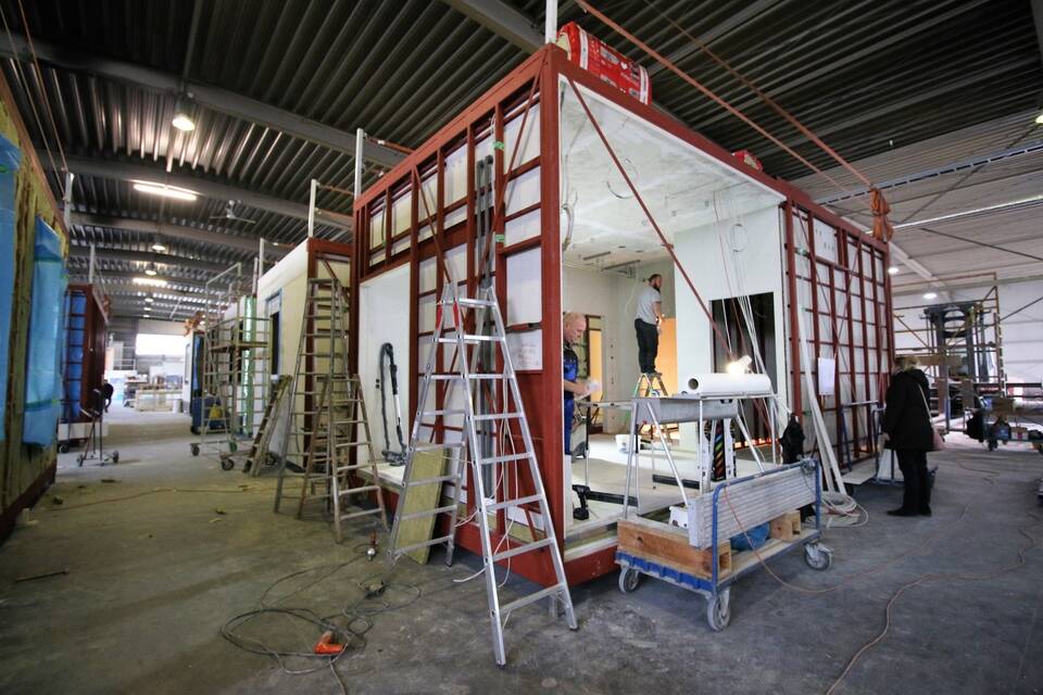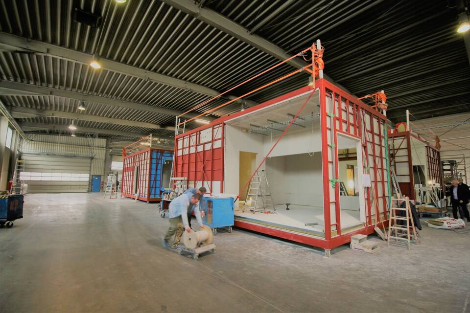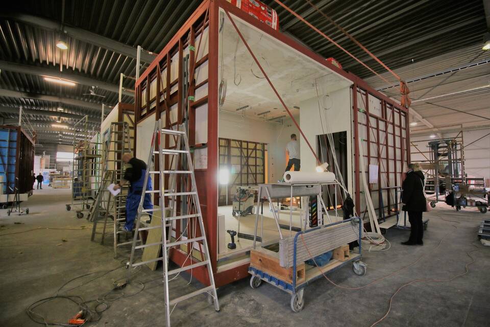 In der nächsten Halle werden Decken, Böden und Wände angebracht. Anders als auf konventionellen Baustellen bietet die Modulbauweise den Arbeitern mehr Komfort: Wie bei der Automobilproduktion werden die Module einfach um 180 Grad gedreht, so dass kein lästiges Arbeiten über Kopf erforderlich ist.