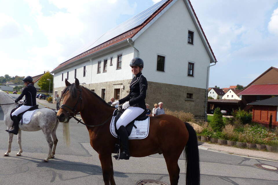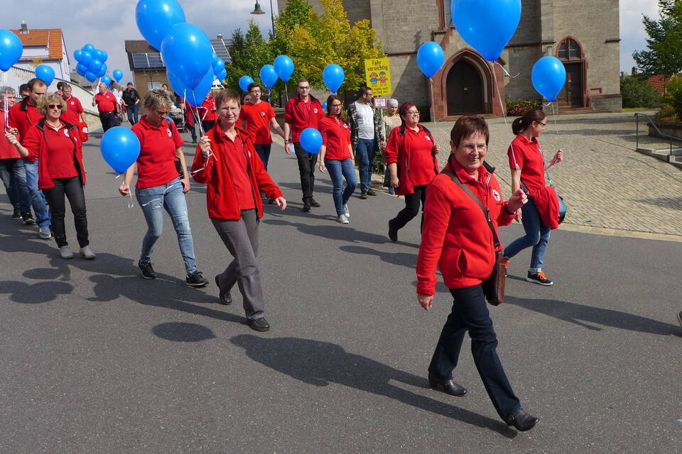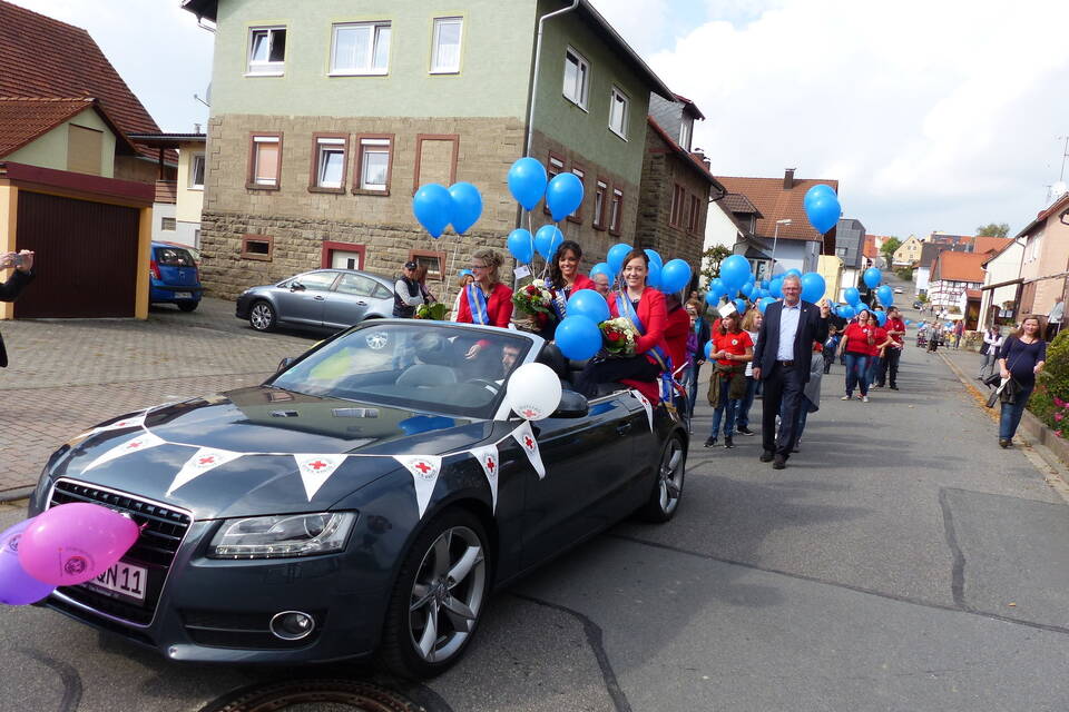 Am Sonntag stand der große Festzug verbunden mit dem Ballonwettfliegen im Mittelpunkt des Festprogramms. Die Reiter des Reit- und Fahrvereins "Höpfinger Pferdefreunde" führten den farbenfrohen Zug traditionsgemäß an. Dahinter folgten die Kinder der Vorschule, der Kindergärten von Höpfingen und Waldstetten mit ihren Eltern sowie die Grundschüler mit ihren blauen Luftballons. Für den nötigen Gleichschritt sorgte danach die Trachtenkapelle Höpfingen unter der Regie ihres Dirigenten Holger Dörr. Ihre Aufwartung machten anschließend die adretten Festdamen, Festkönigin Michaela Greß und ihre beiden Begleiterinnen Rebecca Eiermann und Ronja Weber, sowie die Repräsentanten der Gemeinde und der Politik mit Bürgermeister Adalbert Hauck und MdB Alois Gerig sowie die zahlreichen Mitglieder des DRK-Ortsvereins mit seinem Vorsitzenden Norbert Kuhn.