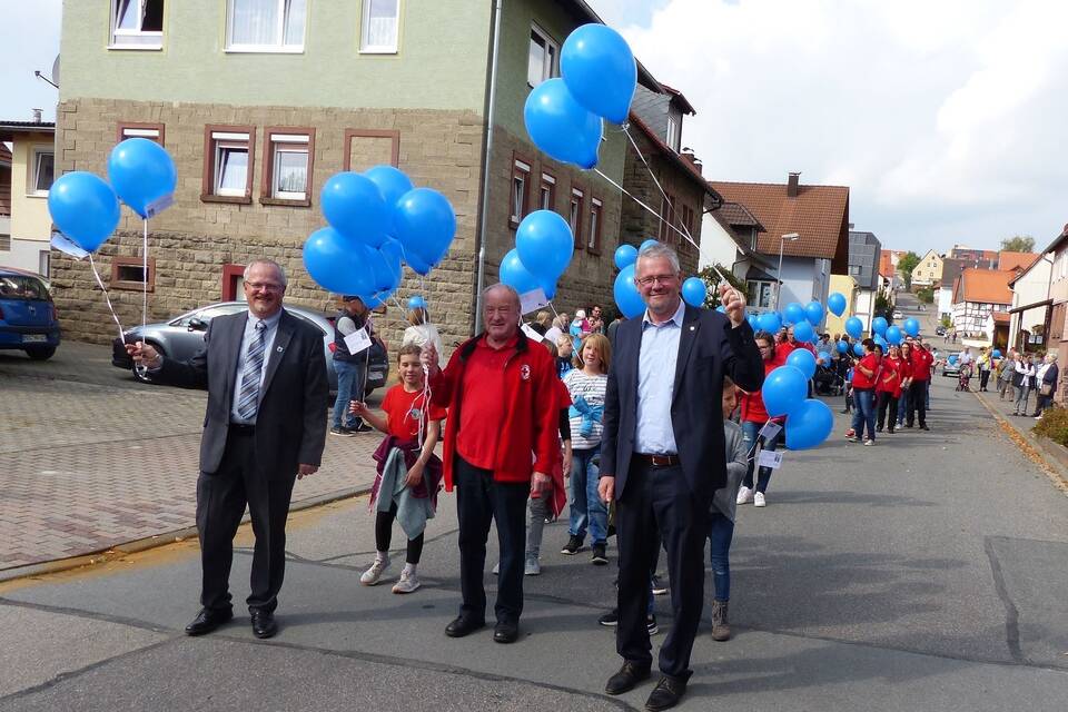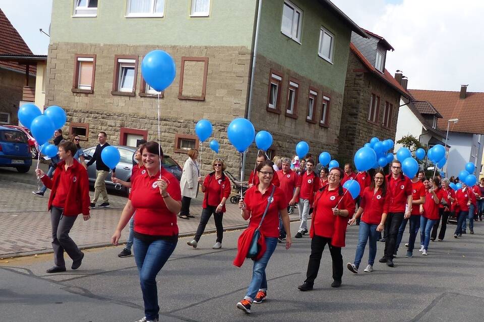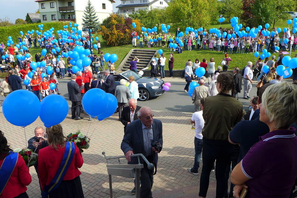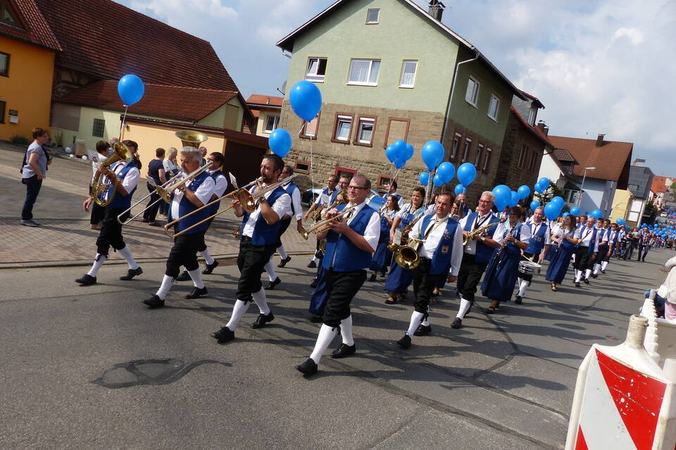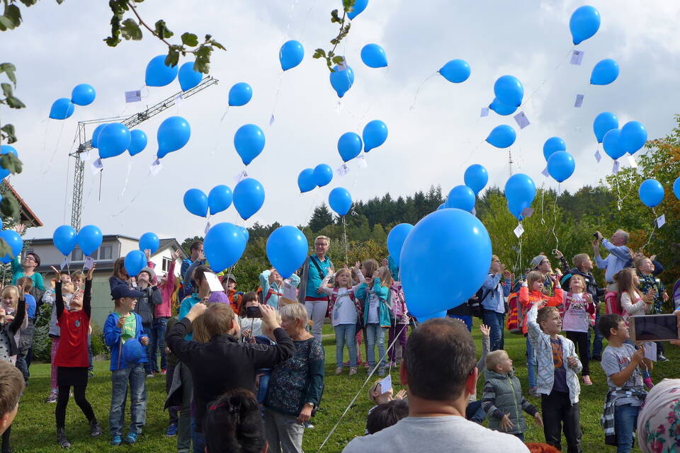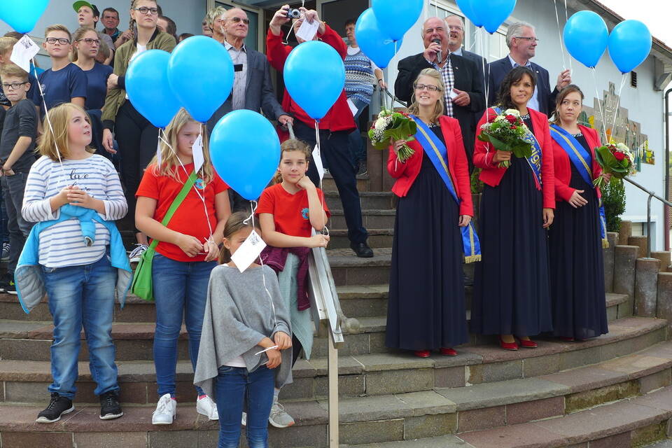 Beim Festplatz vor der Obst- und Festhalle angekommen, hieß Organisator Erwin Nentwich die große Schar der Festbesucher willkommen. Als danach das Orchester traditionell das "Muss i denn zum Städtele hinaus" intonierte, entließen die Kinder und die Erwachsenen ihre über 600 blauen Ballons gen Himmel in Richtung Westen - verbunden mit der Hoffnung, dass die angehängten Ballonkarten weit entfernt von Höpfingen gefunden und wieder zurückgeschickt werden.