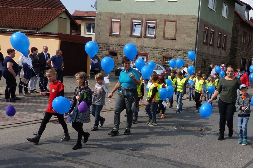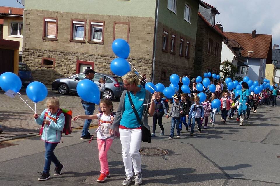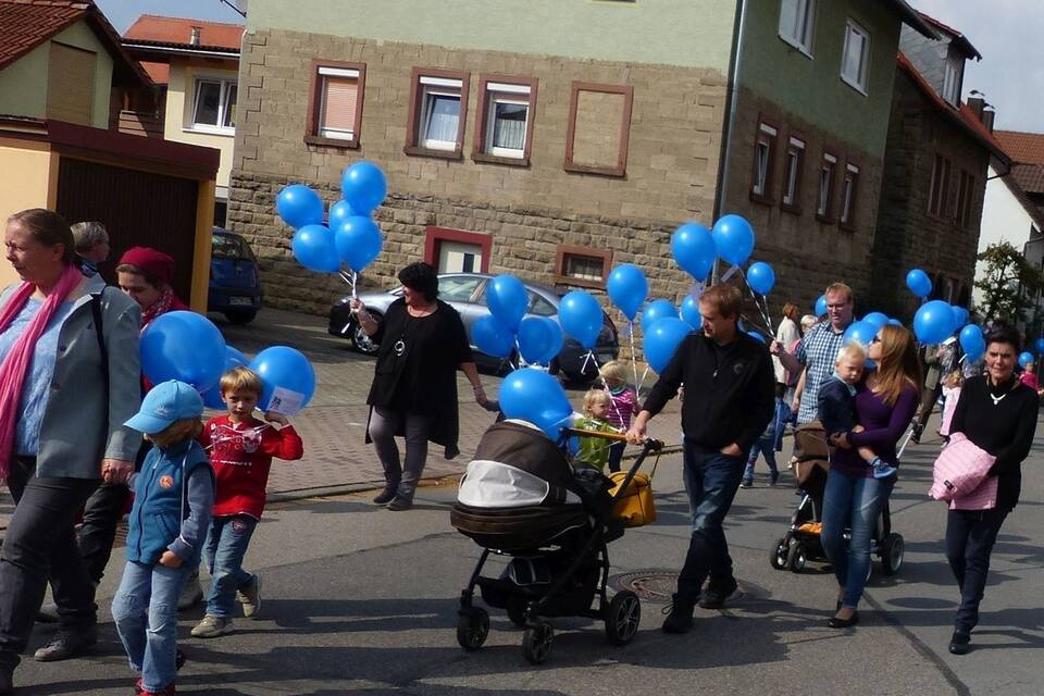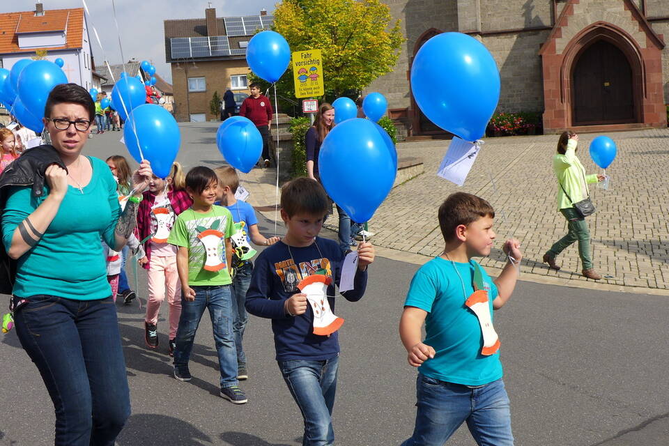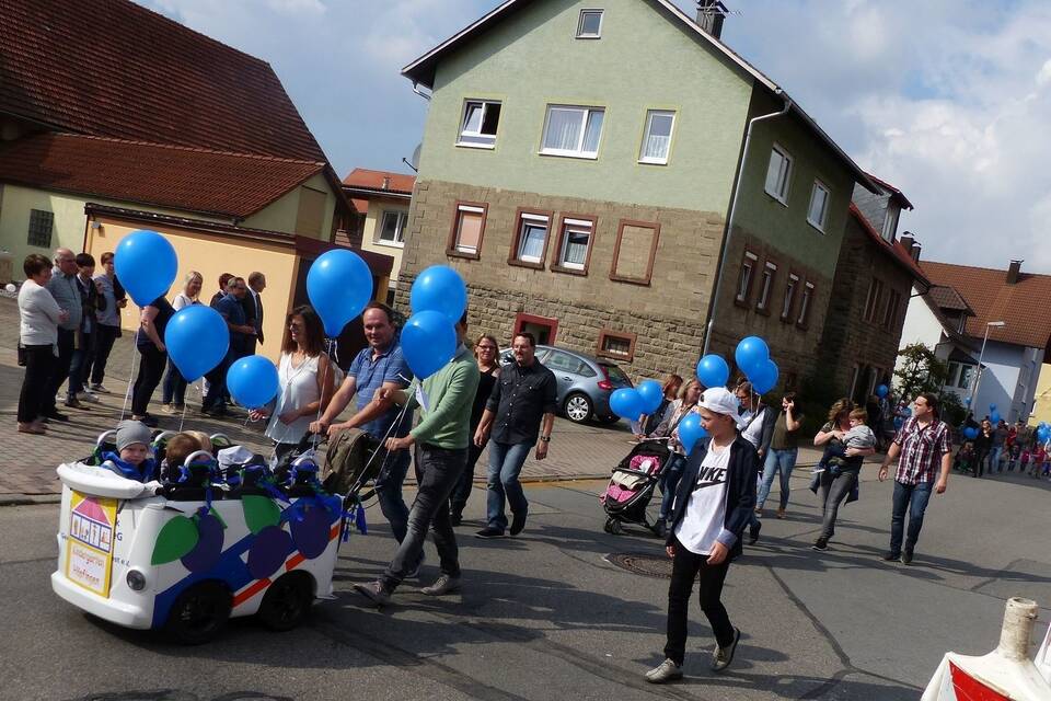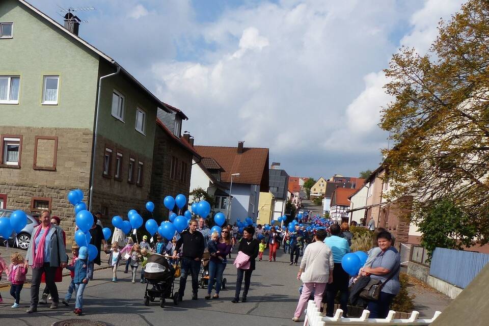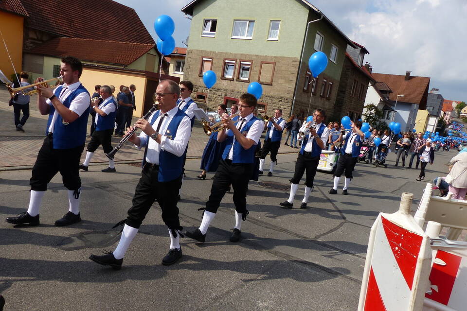 Beim Festplatz vor der Obst- und Festhalle angekommen, hieß Organisator Erwin Nentwich die große Schar der Festbesucher willkommen. Als danach das Orchester traditionell das "Muss i denn zum Städtele hinaus" intonierte, entließen die Kinder und die Erwachsenen ihre über 600 blauen Ballons gen Himmel in Richtung Westen - verbunden mit der Hoffnung, dass die angehängten Ballonkarten weit entfernt von Höpfingen gefunden und wieder zurückgeschickt werden.