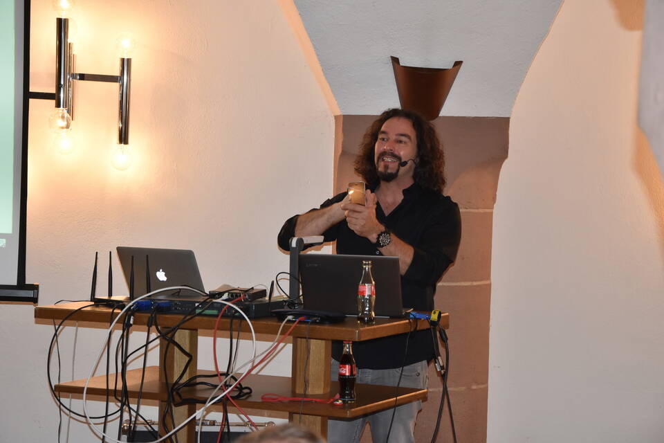 IT-Sicherheitsexperte Erwin Markowsky gab im Rathaussaal einen interaktiven Einblick in die Techniken des Datendiebstahls und der Manipulation von Informationen. Foto: Frank Heuß