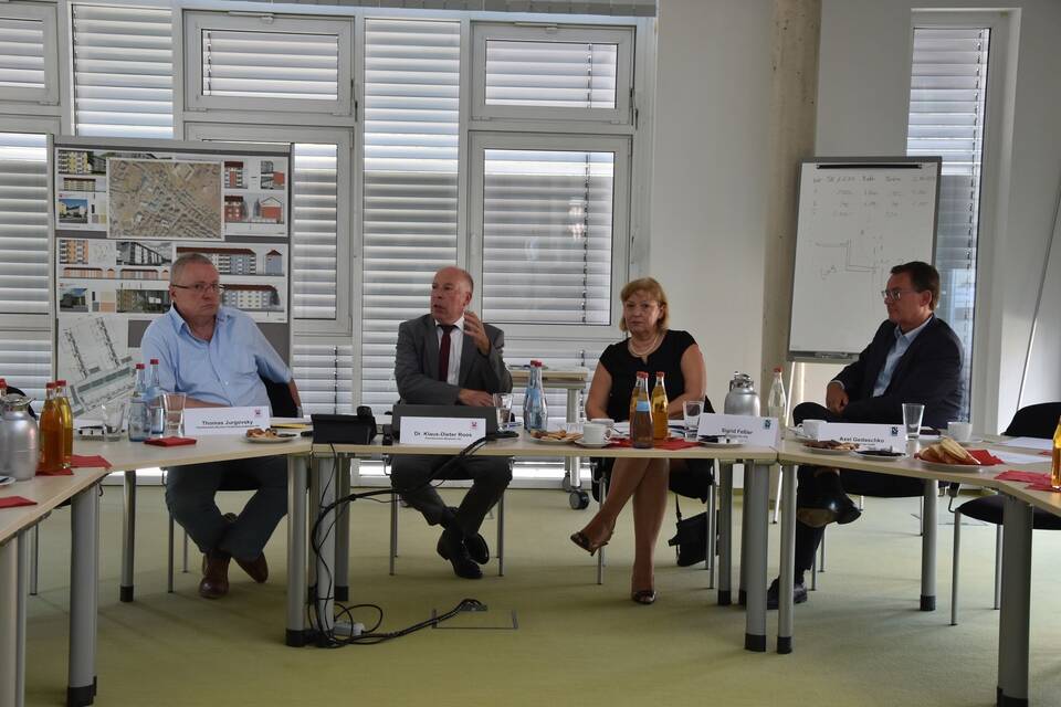 Der Präsident des GdW Bundesverbandes deutscher Wohnungs- und Immobilienunternehmen, Axel Gedaschko (r.), kam zu einer Fachtagung nach Neckarelz und stand gemeinsam mit dem Vorstand der BG Familienheim Buchen-Tauberbischofsheim, Thomas Jurgovsky, dem Vorstandsvorsitzenden der gastgebenden BG Familienheim Mosbach, Dr. Klaus-Dieter Roos, und der Direktorin des Verbands baden-württembergischer Wohnungs- und Immobilienunternehmen, Sigrid Feßler, (v.l.) bei einer Pressekonferenz Rede und Antwort. Foto: Frank Heuß