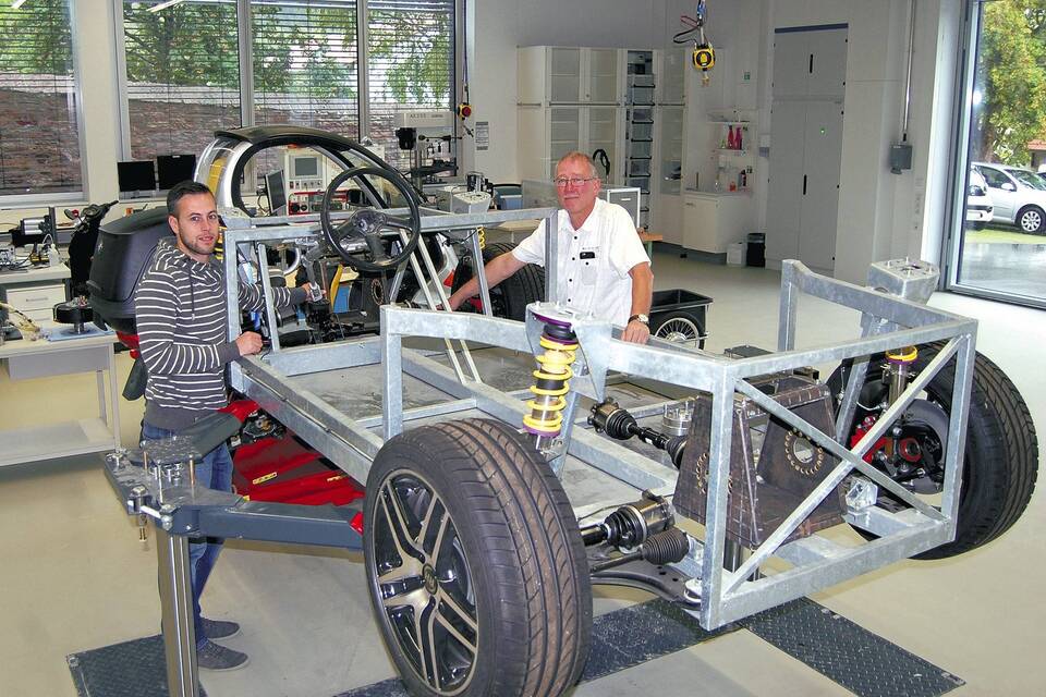 Eines dieser jahrgangsübergreifenden Projekte ist der E-Bugster. Seit vier Jahren entwickelt, konstruiert und baut man das Elektroauto, das in "zwei bis drei Jahren" (so Kleins Einschätzung) als schnittiger Sportwagen mit offenem Dach auf der Straße (zumindest in Mosbach) rollen soll. Alle vier Räder sollen dann von einem je 80 Kilowatt starken Elektromotor angetrieben werden, "direkt an der Radnabe, das ist am effektivsten", konkretisiert Prof. Dr. Klein. Nahezu alle Fahrzeugteile werden am Ende Eigenkonstruktionen sein, mit 320 KW Leistung dürfte der "E-Bugster" dann ein echt flotter Flitzer werden - wenn er denn fertig ist. Bis er wirklich fährt, ist nämlich noch viel zu tun, wenngleich die ersten vier Studentenjahrgänge bereits wertvolle Grundlagenarbeit geleistet haben, Rahmen, Aufhängungen oder Motorhalterungen konstruiert und gebaut haben.