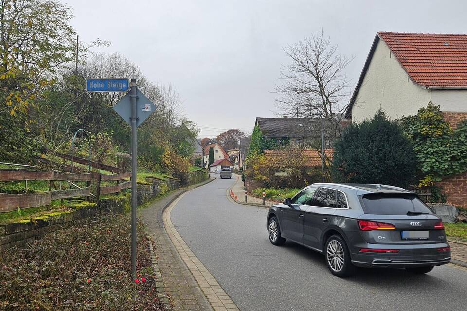Mosbach. Nüstenbach, Ortsdurchfahrt. Von Lohrbach kommend fährt ein Auto durch die Straßenverengung vor dem Dorfplatz. Ein entgegenkommendes Fahrzeug