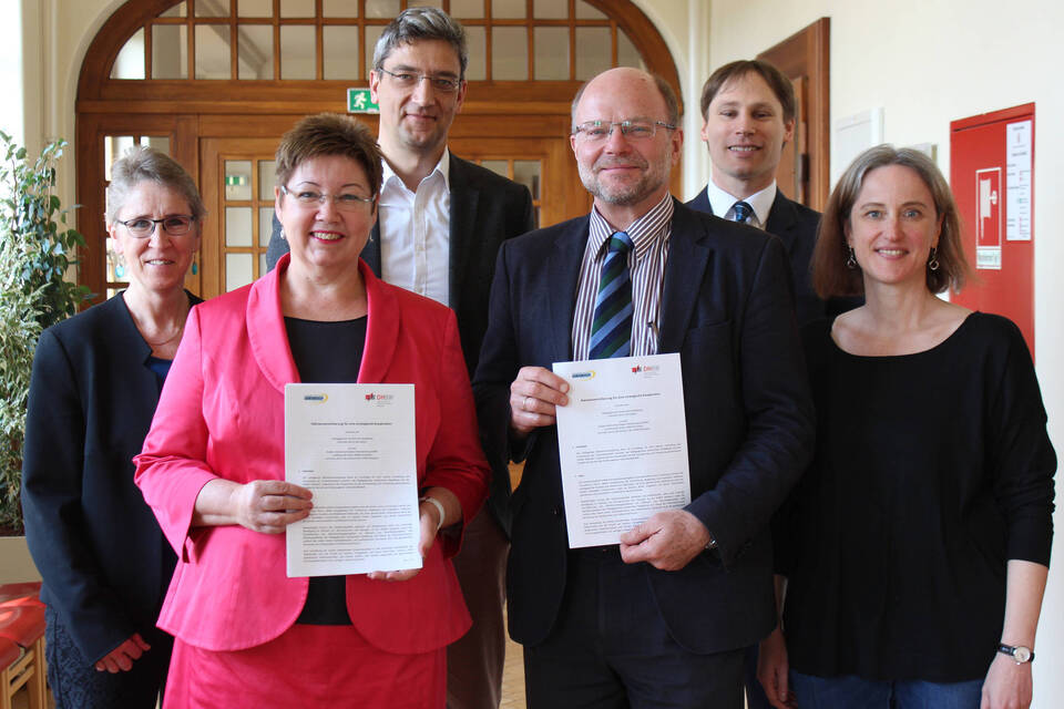 Prof. Dr. Gabi Jeck-Schlottmann (DHBW Mosbach, vorne links) und Rektor Prof. Dr. Hans-Werner Huneke (PH Heidelberg, vorne rechts) sowie weitere Verantwortliche der beiden Hochschulen, freuen sich über die neue Rahmenvereinbarung.