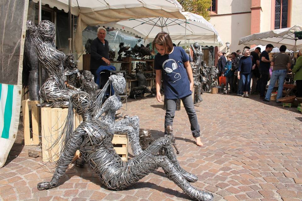 Echtes Handwerk ist auch die Sache von Wolfgang Gerst. Auf dem Marktplatz hat er eine schwergewichtige Menagerie aufgebaut. Drachen und flotte Flitzer, Zentauren und Drahtfrauen geben sich ein munteres Stelldichein. Bei aller motivischen Vielfalt eint alle das Material: alles ist aus Metall geschweißt. "Vor 50 Jahren habe ich Werkzeugmacher gelernt und war schon damals von dem Stoff begeistert", erzählt der Schwarzwälder. Man bekomme im Lauf der Zeit ein Gefühl dafür, beschreibt er seinen reichen Erfahrungsschatz. "Und man muss Spaß daran haben, das ist das Wichtigste. Den Spaß hab ich bis heute nicht verloren." Nur so können schließlich Gebilde entstehen wie eine gut sieben Meter hohe Giraffe, die Gerst einem Interessierten auf dem Handy präsentiert. Der Minotaurus ist sein Lieblingsstück. Einen Plan oder eine Skizze benötige er nicht: "Das ist im Kopf fertig. Ich weiß genau, wie es aussieht."