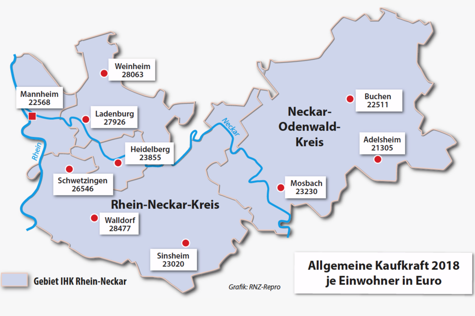 Neckar-Odenwald-Kreis. (red) Die Industrie- und Handelskammer (IHK) Rhein-Neckar veröffentlicht zum vierten Mal eine Kaufkraftanalyse für den IHK-Bezirk, die detaillierte Informationen zu allen 18 Ober-, Mittel- und Unterzentren enthält. Die Kaufkraftzahlen geben Aufschluss über das Konsumpotenzial sowie über die Attraktivität des Einzelhandelsstandortes. "Das Ergebnis der Untersuchung ist wieder sehr erfreulich. Der Bezirk der IHK Rhein-Neckar behauptet als Einzelhandelsstandort seine überdurchschnittlich und überregional attraktive Position", so IHK-Hauptgeschäftsführer Dr. Axel Nitschke.