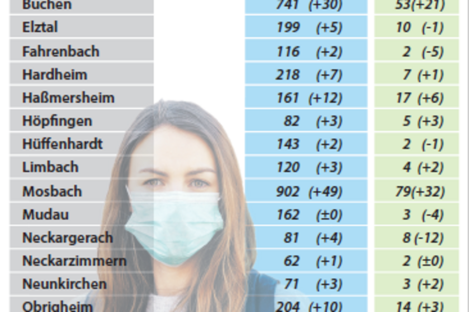 Wie jeden Montag hat das Landratsamt die Fallzahlen aus den Kommunen veröffentlicht. Die meisten Neuinfektionen gab es in Buchen, Mosbach und Schwarzach (jeweils 35). Hier macht sich der Ausbruch in der Johannes-Diakonie in Schwarzach bemerkbar.