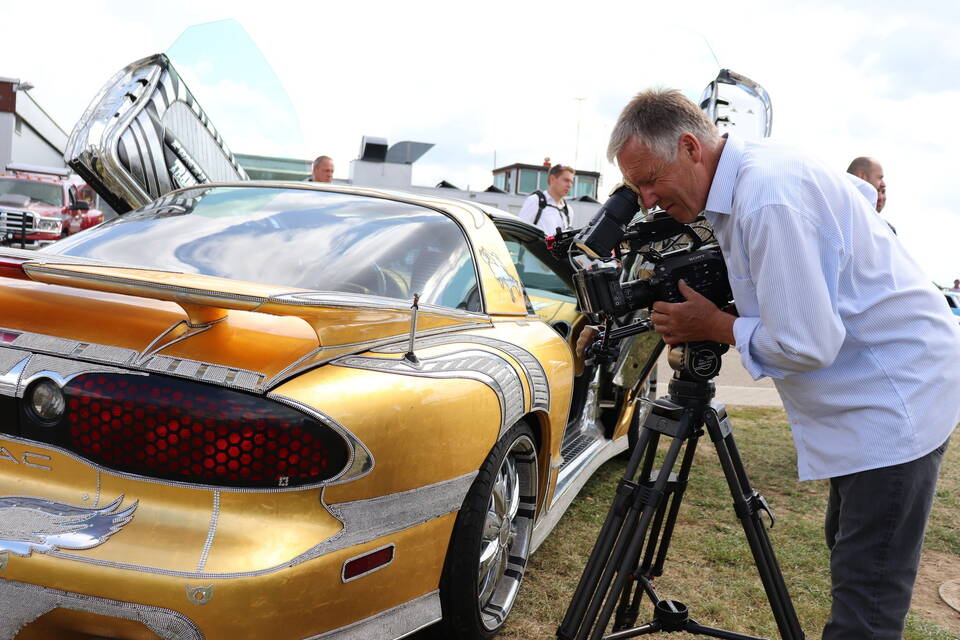 Hingucker en masse: Rund 500 Old- und Youngtimer, American Cars und Tuningfahrzeuge verliehen am Wochenende dem Areal am Flugplatz in Lohrbach besonderen Glanz. Für besonderen Glamourfaktor sorgte ein mit 400 000 Swarovski-Steinen und Blattgold dekorierter Trans Am, der von einem Filmteam des SWR begleitet wurde. Fotos: Schattauer