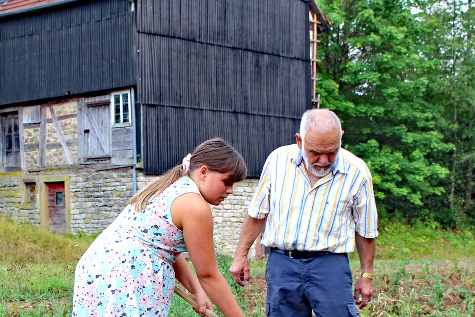 Nach weiteren Tipps, wie man zum Beispiel mit Neem-Öl oder regelmäßigem Wechsel der Anbaufläche den Kartoffelkäfer fernhält, durften sich die Teilnehmer selbst daran versuchen, mit einem "Karscht" die Knollen aus dem Museumsacker auszugraben. Was dabei sofort augenscheinlich wurde: Der Ertrag bei den speziellen Sorten ist deutlich geringer. "Wenn ich die kleinen Knollen schäle, bleibt ja gar nichts mehr über", brachte es eine Teilnehmerin aus Laudenberg auf den Punkt. Zu dementsprechend teureren Preisen müssen die Erzeuger diese Sorten auf den Wochenmärkten oder in ihren Bauernläden anbieten. "Die Verbraucher haben es mit ihrem Einkaufsverhalten in der Hand, ob solche alten Sorten weiter bestehen", appellierte Monika Frisch an die Teilnehmer der Führung.