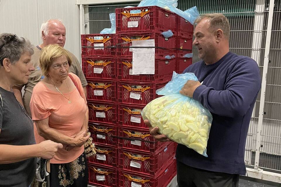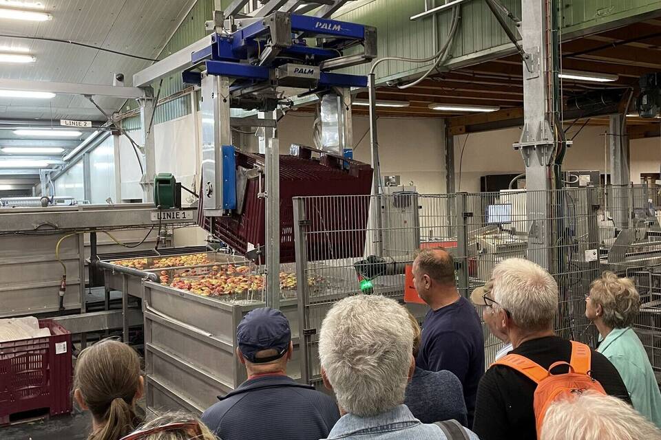Zwei Stunden lang führte Arno Gätschenberger die ausgelosten Besucherinnen und Besucher durch den Betrieb. Erst hinein in eine Plantage, dann vorbei an der großen automatischen Apfelwasch- und Sortieranlage hin zu einer der ganz speziellen Lagerhallen, in denen man normalerweise gar nicht Atmen kann.