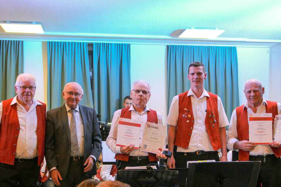 Als Zeichen des Dankes überreichte Friedlein den Brüdern eine Urkunde für ihre 60-jährige aktive Mitgliedschaft. Herbert Münkel, Präsident des Blasmusikverbands Tauber-Odenwald-Bauland, schloss sich den Glückwünschen an und betonte den Vorbildcharakter der beiden "Urgesteine" für die Vereinsarbeit und den Nachwuchs. Er verlieh ihnen die Ehrennadel in Gold mit Diamant des Blasmusikverbands – die höchste Auszeichnung für langjährige Verdienste um die Blasmusik.