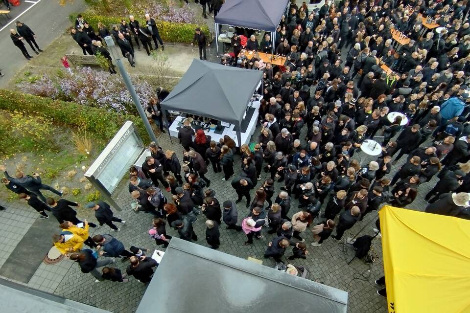 Schefflenz. (bd) "Back in Black" hieß die Aufgabe, die Legenden von AC/DC lieferten den Soundtrack, mit dem Schefflenz am Freitagabend in das "Hitmach-Duell" des Radiosenders SWR1 gegen Kirchentellinsfurt ging: Ziel war es demnach, möglichst viele Menschen in schwarzer Kleidung auf den Rathausplatz zu bringen. Und Schefflenz lieferte.