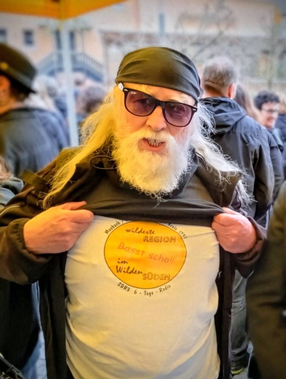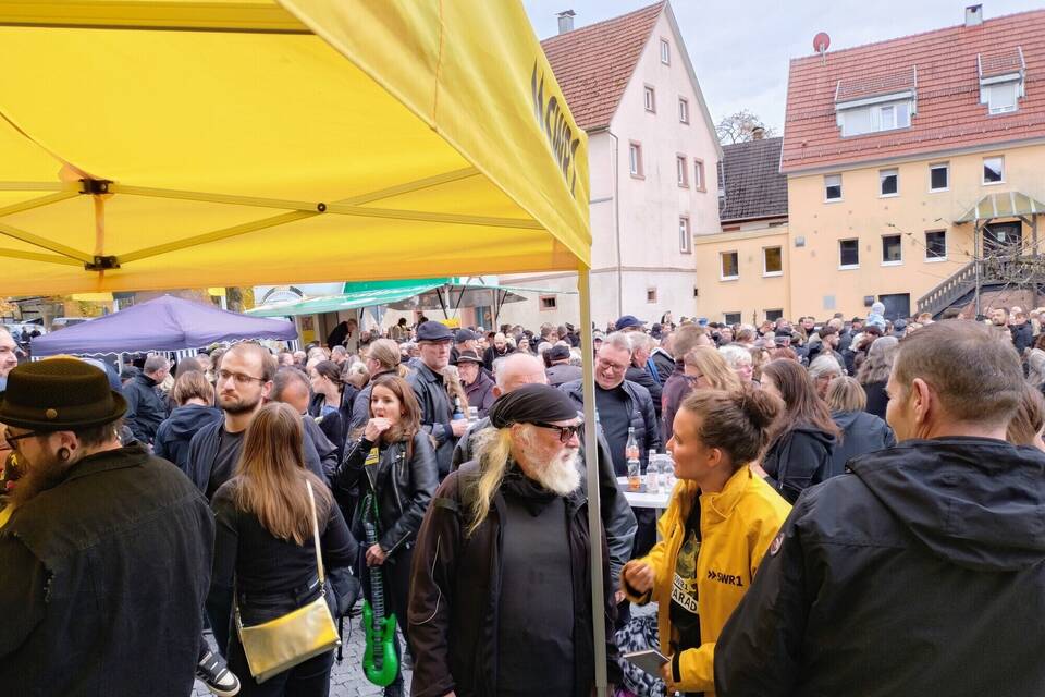 Inmitten der (dunklen) Menge leuchteten zwei gelbe Punkte: Moderator Benedict Walesch und Kollegin Sophia Möhle in den sonnengelben SWR-Jacken. Im Gespräch mit Fans wie Rock-Veteran Atze Stirnal, der eigens aus Buchen angereist war, stilecht mit schwarzer Bandana und Sonnenbrille – darunter ein T-Shirt vom SDR 3 6-Tage-Radio aus dem Jahr 1997, als Mosbach den Titel der "wildesten Region im wilden Süden" errang. Beste Vorzeichen also für einen neuerlichen Sieg am "Black Friday".