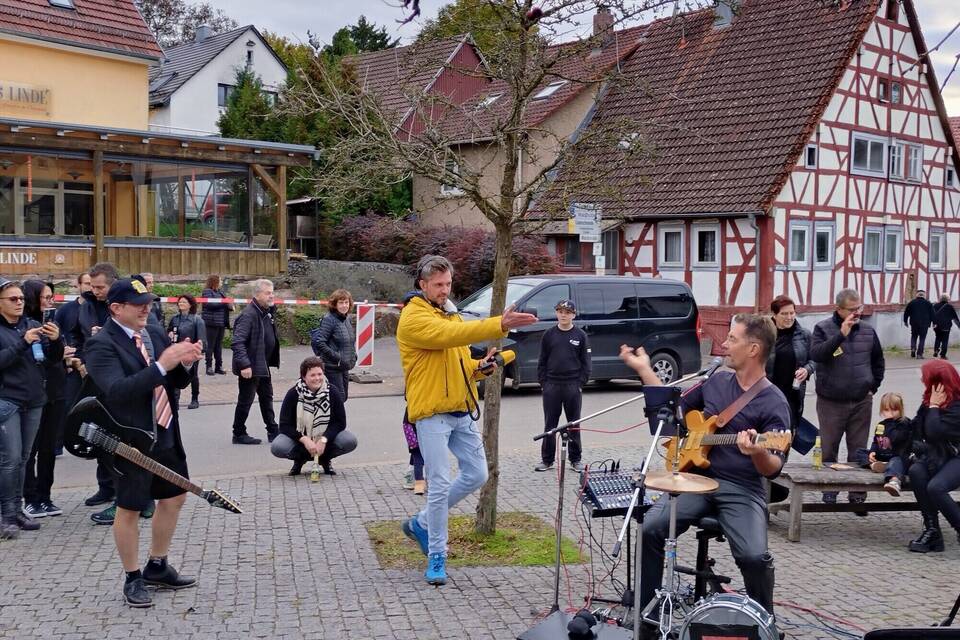 Schon ab 16.30 Uhr war der Rathausvorplatz richtig voll: Men and Women in Black, viele mit AC/DC- oder Wacken-Shirts, vereinzelt war auch die SWR1-Hitparadenkatze auf schwarzem Textil präsent. Für das leibliche Wohl sorgten der Rolling-Stones-Fanclub, die Eltern der Schefflenztalschule und der Kindergarten Schefflenz mit Essen und Getränken. Musikalische Energie lieferte die Hossa-Guggemusik, und auch für die Kinder war mit einer Hüpfburg bestens gesorgt.