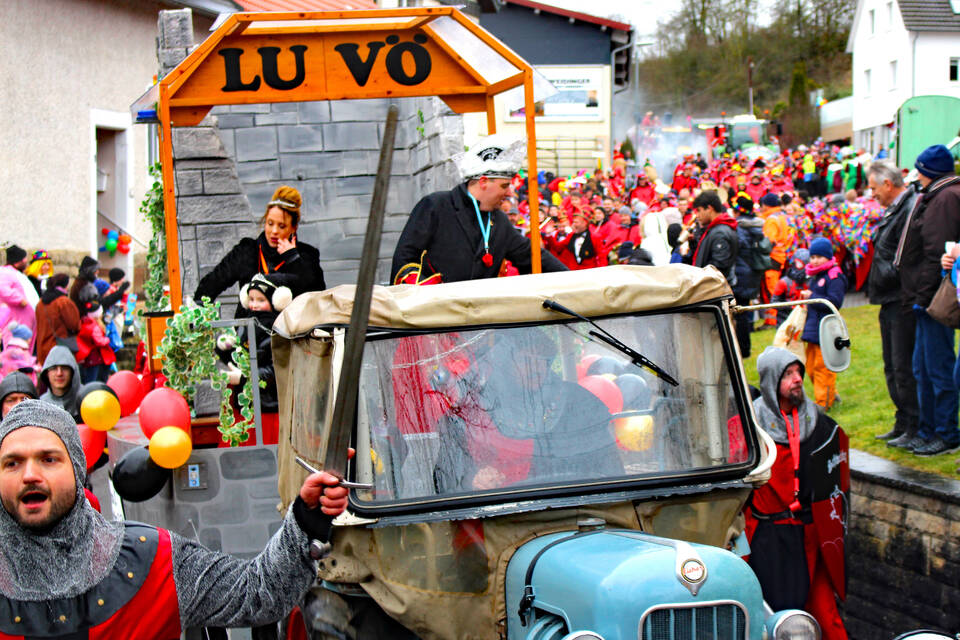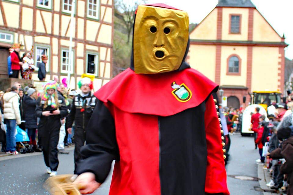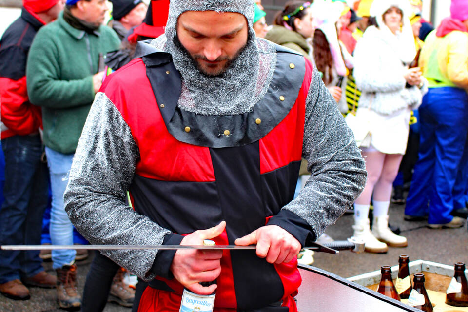 Hardheim-Schweinberg. (jam) Allerlei Federvieh, Burgdämonen und furchtlose Ritter – unterstützt von zahllosen Narren aus der näheren Umgebung – haben am Sonntag in den Straßen und Gassen von "Schwomeri" einen farbenfrohen Gaudiwurm gebildet, der seinesgleichen sucht und gleichzeitig dem trüben Wetter trotzte.