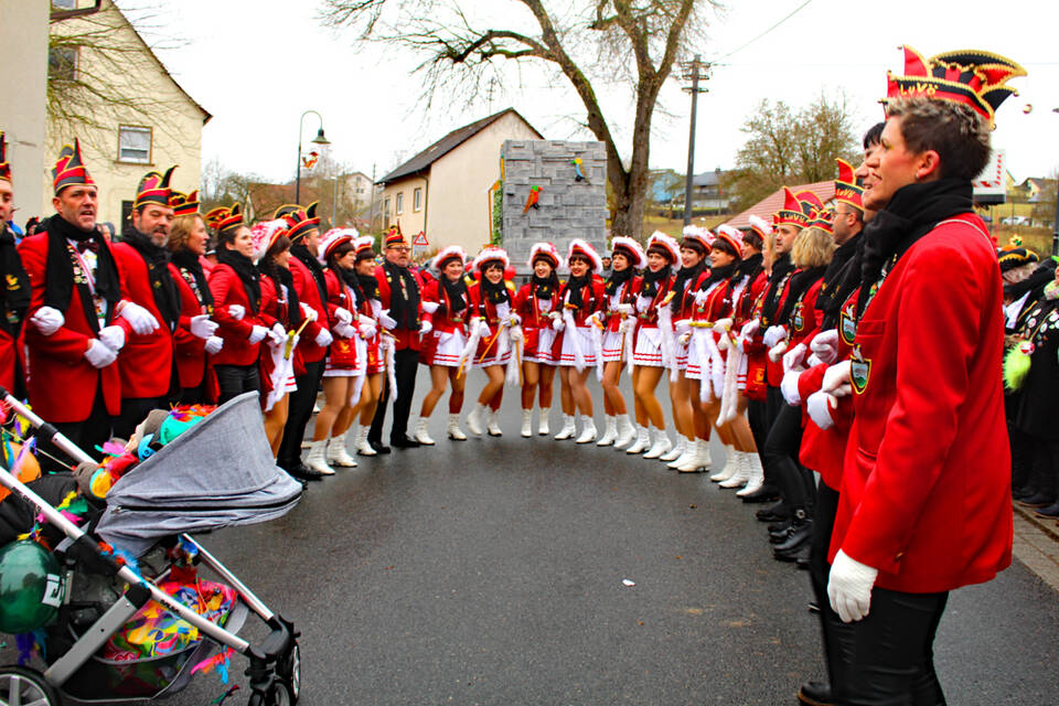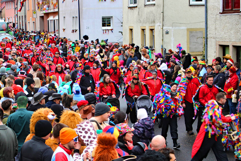 Angeführt vom Fanfarenzug "Fränkische Herolde", bewiesen die gastgebenden "Lustigen Vögel" mit ihrem opulenten Hofstaat, dass sie die gute Laune entlang der Umzugsroute nicht dem Zufall überlassen wollten.