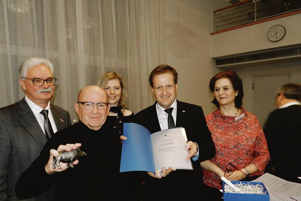Den Bronze-Eber als Dank für den Einsatz um die deutsch-französische Städtepartnerschaft Eberbach/Thonon-les-Bains erhielt Pierre Chevalley (3.v.l.) von Bürgermeister Peter Reichert. Helmut Schultz )v.l.) Patricia Favre und Christine Kley-Guermeur gratulierten. Foto: Deschner