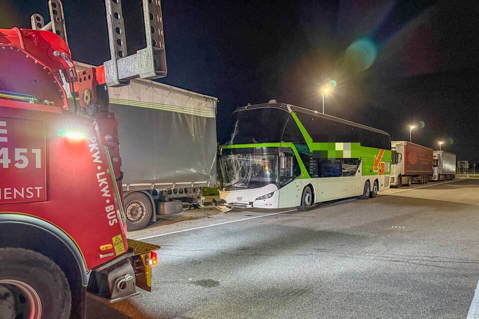 Fernbus prallt in geparkten Sattelzug auf A6-Rastplatz