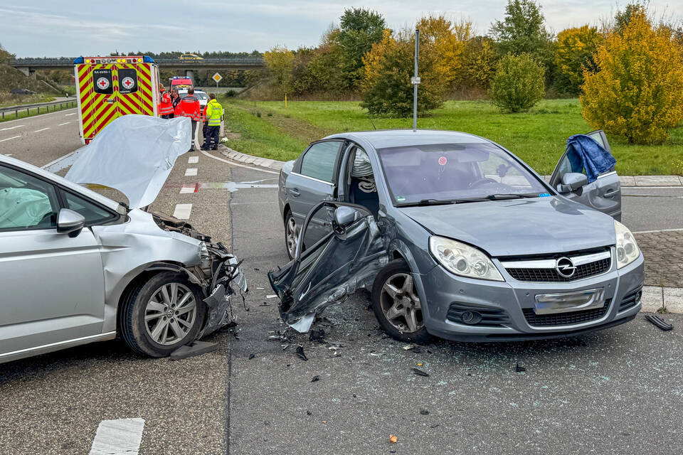 Zwei Fahrzeuge kollidieren an der Kreisstraßen-Einmündung auf der Bundesstraße. Bei dem Unfall wurden vier Personen verletzt, darunter ein Kind.