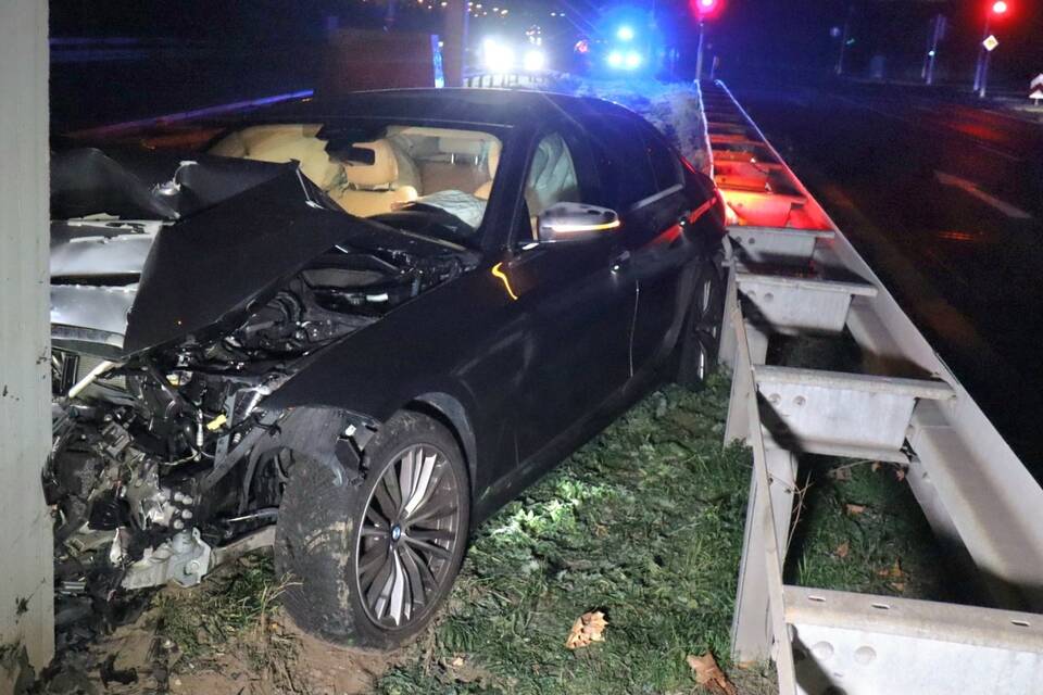 Das Fahrzeug fuhr zwischen die beiden Leitplanken, die die Fahrtrichtungen trennen, und verfehlte dabei einen dort abgestellten Blitzeranhänger nur knapp. Anschließend prallte der BMW frontal gegen einen Brückenpfeiler und wurde schwer beschädigt.