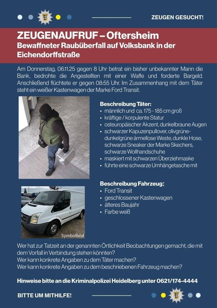 Oftersheim. (pol/nov) Am 6. November überfiel ein noch unbekannter Täter eine Bankfiliale in der Eichendorfstraße in Oftersheim. Die Kriminalpolizeidirektion Heidelberg sucht weiterhin nach Zeugen.